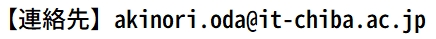 - 小嶋正宏, 大木一真, 小田 昭紀:「アモルファスカーボン成膜用 大気圧 He/CH4プラズマの数値解析 」, 平成30年 電気学会全国大会, 1-084 (2019.3)